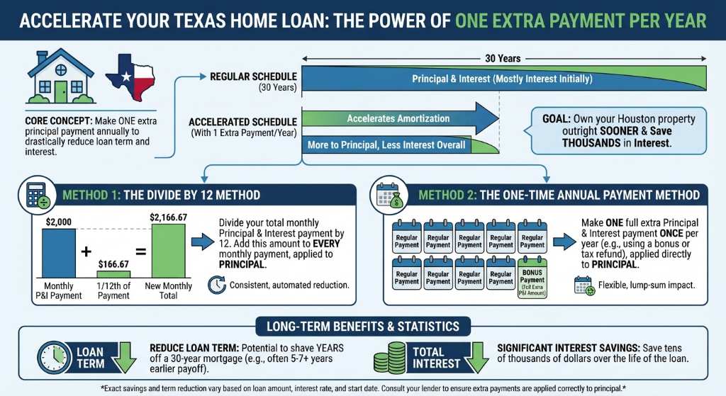 The core of this Texas home loan hack is surprisingly simple. By making just one extra mortgage payment per year applied directly to your principal balance, you can drastically reduce your loan term. This strategy accelerates your amortization schedule, meaning less of your money goes toward interest and more goes toward owning your Houston property outright.